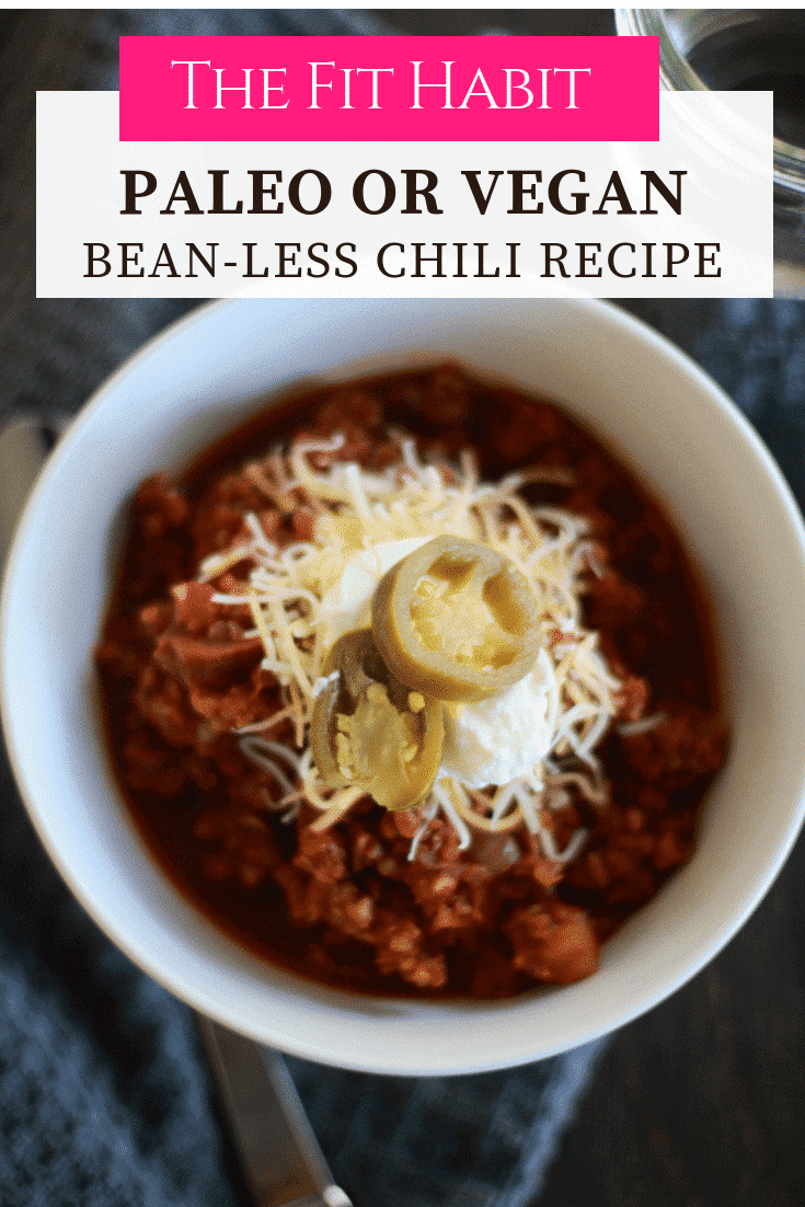 Beanless chili is an awesome quick lunch option with a salad or topped with a couple of fried eggs for breakfast. You seriously can't go wrong with a big pot of this stuff, so don't limit it just as a dinner option. It's the perfect meal prep dish that can last you for a week or more of lunches!